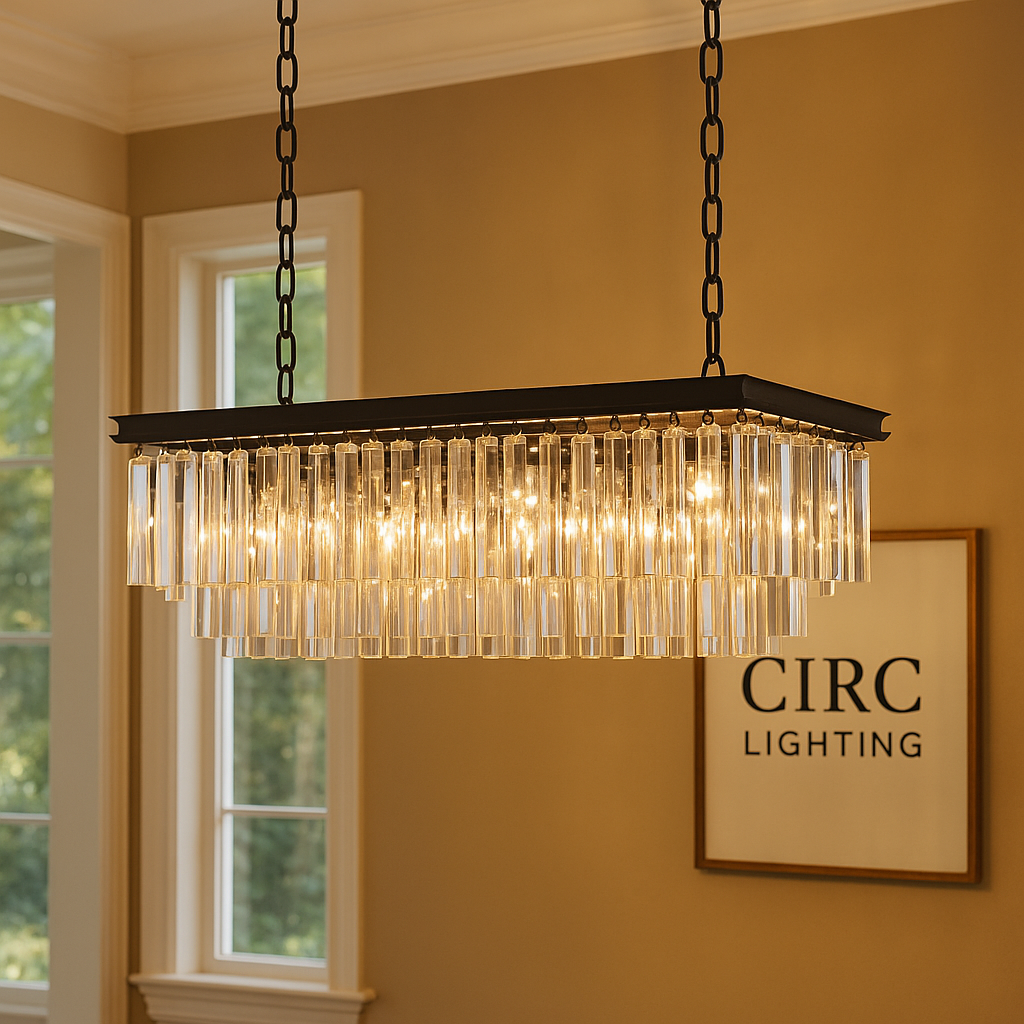 The CIRC 1920s Odeon Rectangular Chandelier 40" captures the glamorous spirit of the Roaring Twenties with its geometric multi-rectangular frame. The iron frame is adorned with a cascade of high-quality K9 glass prisms, a material prized for its use in optical lenses and prisms. These prisms catch and refract the light from the eight candelabra bulbs, creating a spectacular and dazzling display. This linear chandelier is a true statement piece, bringing a touch of vintage luxury and dramatic illumination to a long dining table or kitchen island.