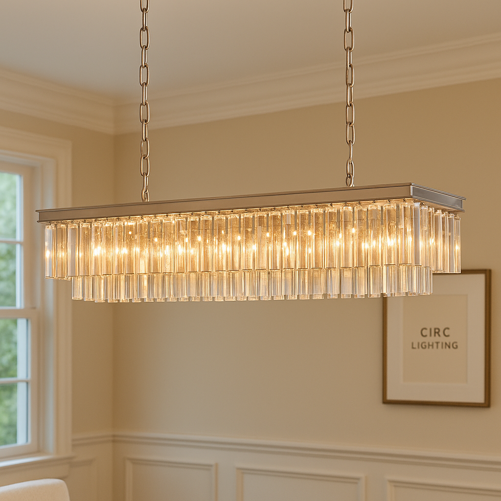 The CIRC 1920s Odeon Rectangular Chandelier 59" captures the glamorous spirit of the Roaring Twenties with its geometric multi-rectangular frame. The iron frame is adorned with a cascade of high-quality K9 glass prisms, a material prized for its use in optical lenses and prisms. These prisms catch and refract the light from the twelve candelabra bulbs, creating a spectacular and dazzling display. This linear chandelier is a true statement piece, bringing a touch of vintage luxury and dramatic illumination to a long dining table or kitchen island.