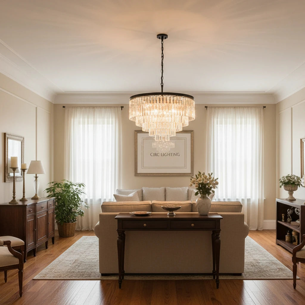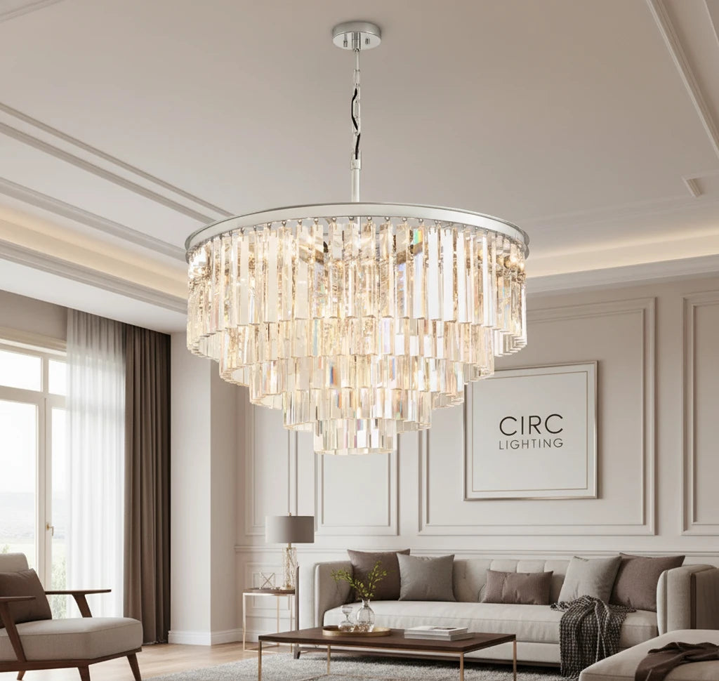 The CIRC 1920s Odeon Round Chandelier 32" embodies the glamorous elegance of the Roaring Twenties with its geometric multi-ring iron frame and cascading K9 glass prisms. These prisms, prized for their optical clarity, beautifully refract light from seventeen candelabra bulbs, filling the room with a dazzling, vintage-inspired glow. A striking centerpiece, this chandelier brings timeless luxury and dramatic illumination to dining rooms, living spaces, or grand entryways.