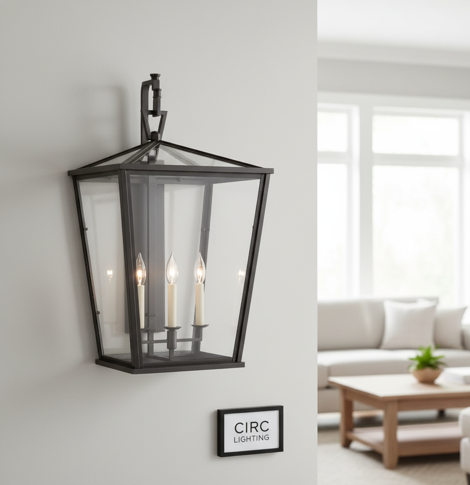 The CIRC 19th C. English Openwork Outdoor Sconce in its grand 28" size exudes the timeless elegance of 19th-century English craftsmanship. With a commanding silhouette and handcrafted steel framework, this lantern-style sconce delivers both architectural presence and refined illumination to outdoor façades or grand entryways.