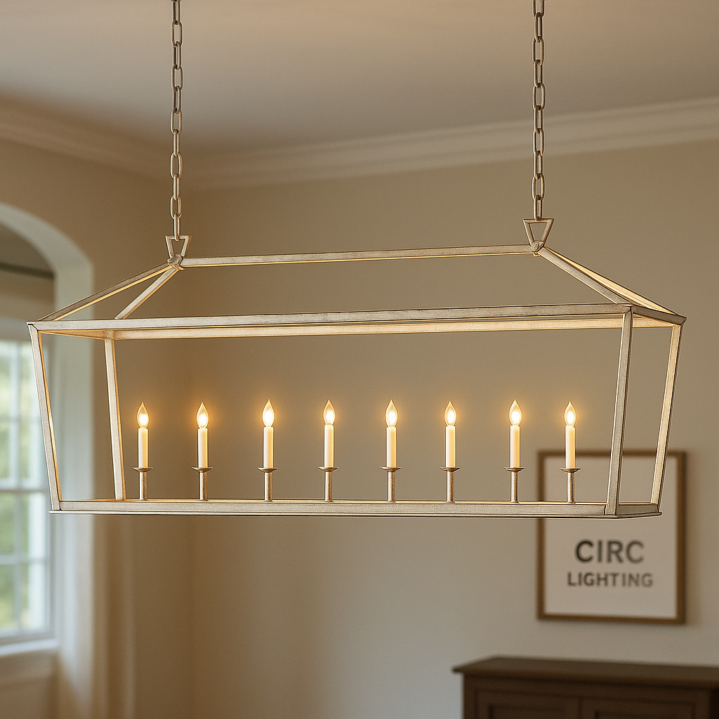 A timeless Vintage Luxury Lighting Fixture, the CIRC 19th C. English Openwork Rectangular Chandelier 72" brings a sense of historical grandeur to any space. Crafted with steel-tube construction, its linear openwork frame is topped with a stirrup-form hook, offering a refined, architectural presence. This chandelier is illuminated by elegant candlestick-style sockets with bobeches, creating a warm, sophisticated ambiance perfect for a large dining table or kitchen island.