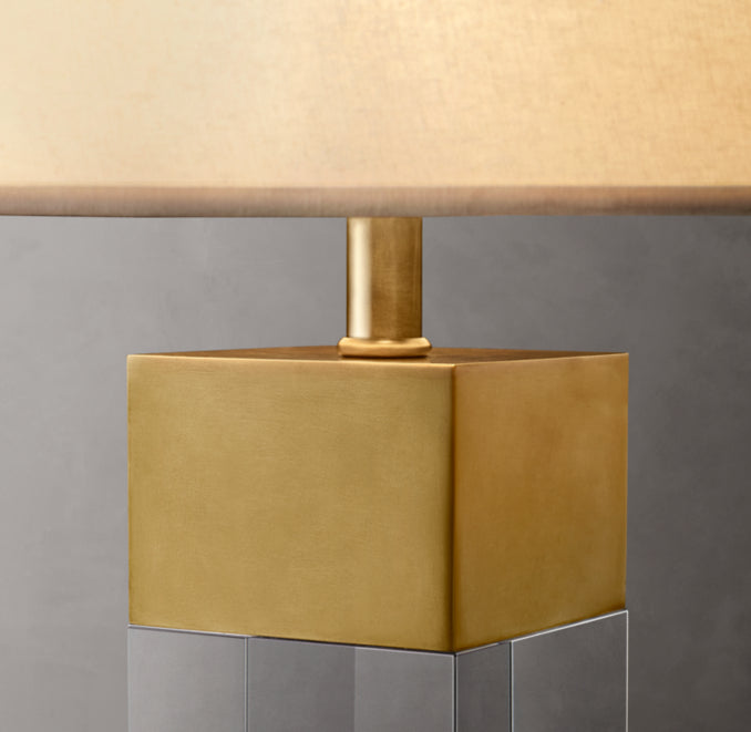 The Alba Crystal Block Table Lamp features a stunning optical-grade crystal glass base paired with solid brass accents, creating a sophisticated and luminous design. Its French wiring ensures an unobstructed view of the transparent base, making it a striking centerpiece in any room.