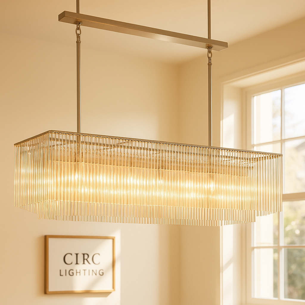 A brilliant and sophisticated Vintage Luxury Lighting Fixture, the CIRC Amadeo Rectangular Chandelier 54" presents a linear showcase of luxury, ideal for anchoring a grand dining table or kitchen island. Crafted of robust iron, the bold frame contrasts beautifully with a dazzling array of crystal rods, each individually carved from clear, solid glass. Illuminated by fourteen exposed bulbs, this chandelier strikes the perfect balance between industrial strength and refined radiance, creating a commanding modern statement.