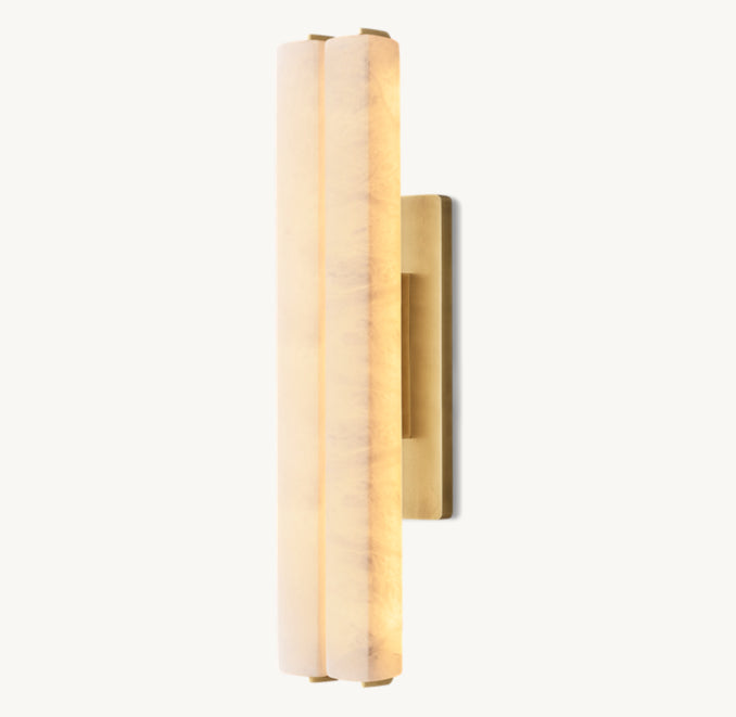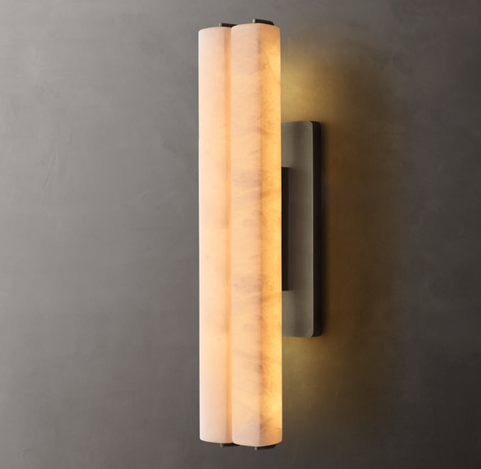 The Audubon Alabaster Double Sconce features a handcrafted solid brass frame with two alabaster prisms, providing a refined, sculptural accent. Each sconce is unique due to natural variations in alabaster vein patterning and color. Designed for vertical or horizontal mounting, it delivers versatile ambient lighting for hallways, bedrooms, or living areas. Available in three sizes for different spaces.