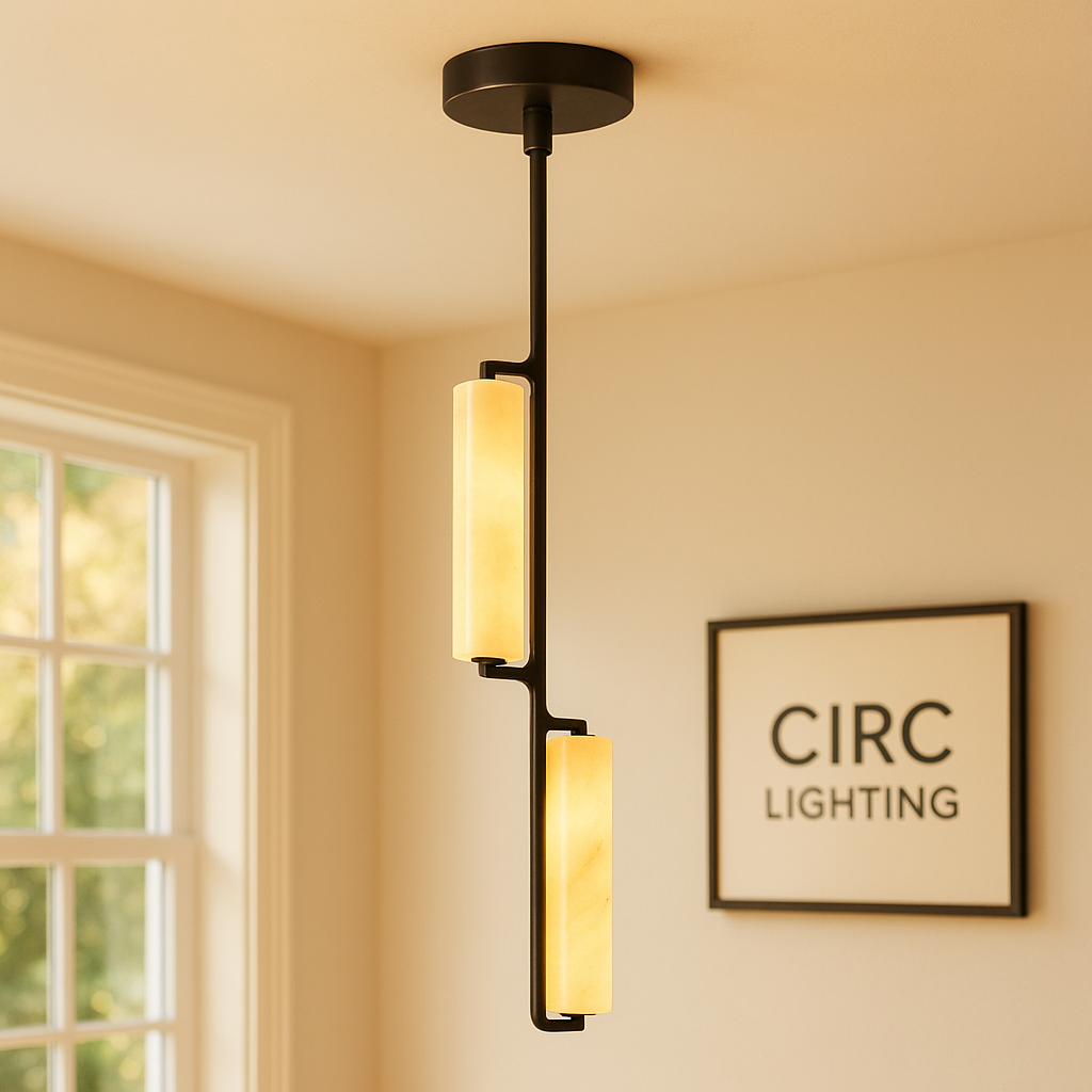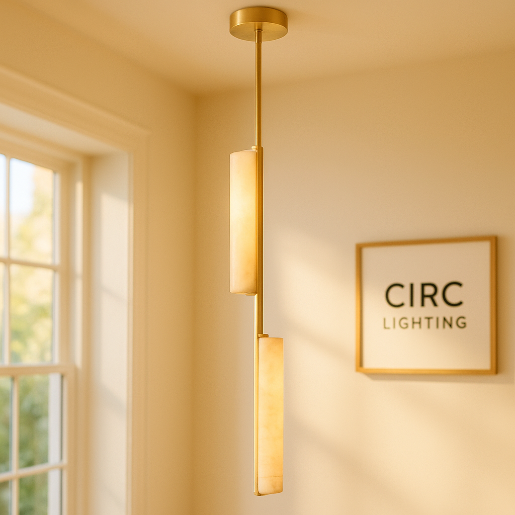 A sophisticated and organic Vintage Luxury Lighting Fixture, the CIRC Audubon Alabaster Pendant replaces crystal with the natural beauty of stone. The fitting is meticulously handcrafted of brass, which securely holds two prominent prisms of natural alabaster. The alabaster stone is noted for its wide variation in vein patterning and color, ensuring each pendant is a unique piece of art. It features an integrated LED board that emits a very warm, intimate light, making it ideal for creating dramatic, refined lighting statements in luxury interiors.