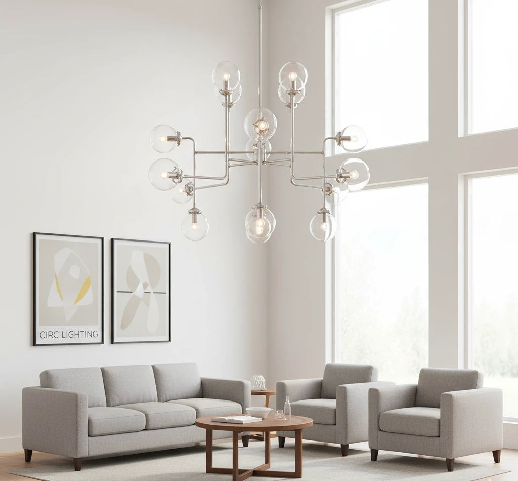 Bring timeless elegance and modern sophistication to your space with the CIRC Bistro Globe Clear Glass Chandelier 56". Designed on a grand scale, this vintage luxury lighting fixture combines steel, aluminum, and glass into a sleek frame supporting sixteen 6" clear glass globes. Each globe softly diffuses the light, casting a warm, inviting glow — ideal for large dining rooms, open living areas, or even bathrooms thanks to its damp-rated certification.