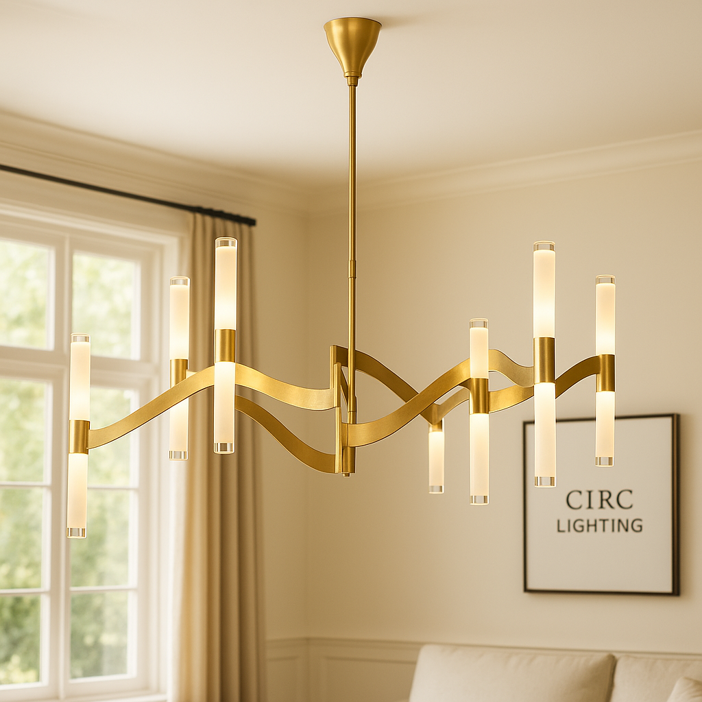 A sculptural Vintage Luxury Lighting Fixture, the CIRC Brenta Chandelier 55" is a stunning combination of modern form and timeless elegance. Its rich-finished, handcrafted brass frame forms a graceful silhouette, while the interior-etched glass shades soften and diffuse the light. The integrated LED light strip casts a warm and inviting glow, enhancing the chandelier's sculptural presence. Certified for damp locations, this piece provides a sophisticated lighting solution that is equally suited for living spaces and moisture-prone areas such as bathrooms.