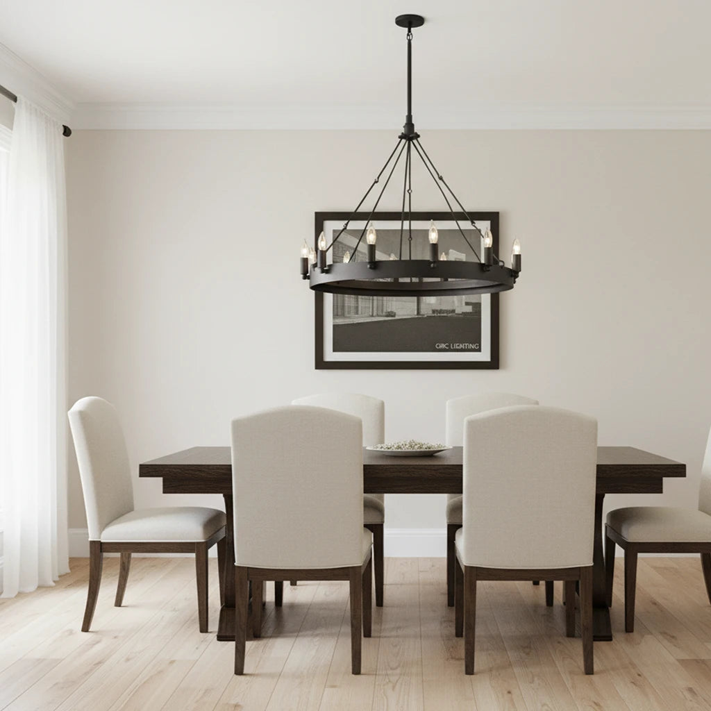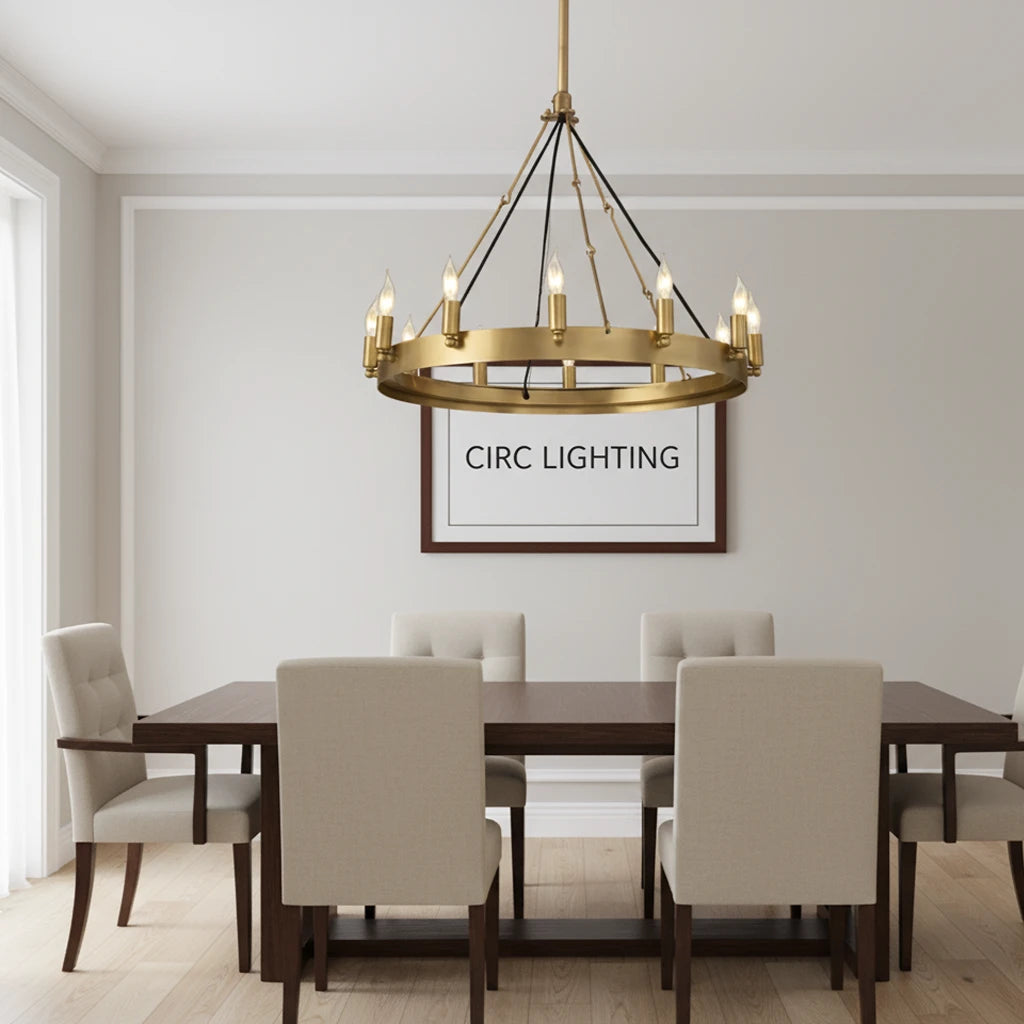 The CIRC Camino Vintage Candelabra Round Chandelier 26" is a perfect blend of industrial craftsmanship and vintage charm. Featuring a hand-forged, bent-angle brass ring and a circle of classic candelabra flame bulbs, this chandelier brings a warm, inviting glow to any room. Sheet metal-wrapped sockets and a textured cast ceiling plate provide an authentic, rustic yet refined finish — ideal for intimate dining spaces or entryways.