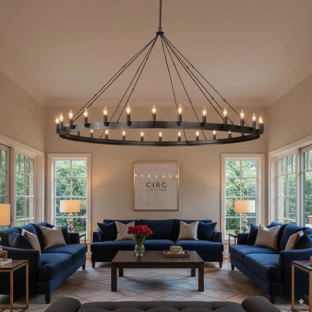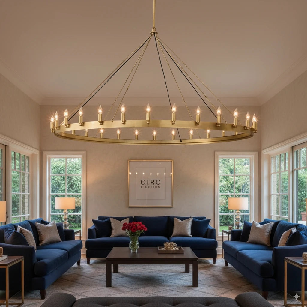 The CIRC Camino Vintage Candelabra Round Chandelier 63" is a statement piece that blends industrial craftsmanship with timeless vintage charm. Its hand-forged, bent-angle brass ring is meticulously edged with classic candelabra flame bulbs, while sheet metal-wrapped sockets and a textured cast ceiling plate add to its refined rustic character. This large-scale chandelier delivers a warm, inviting glow, perfect for grand dining rooms, great rooms, or entryways.