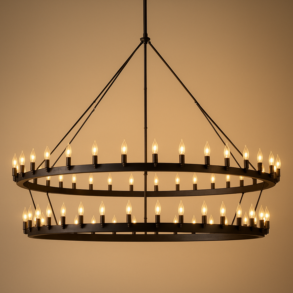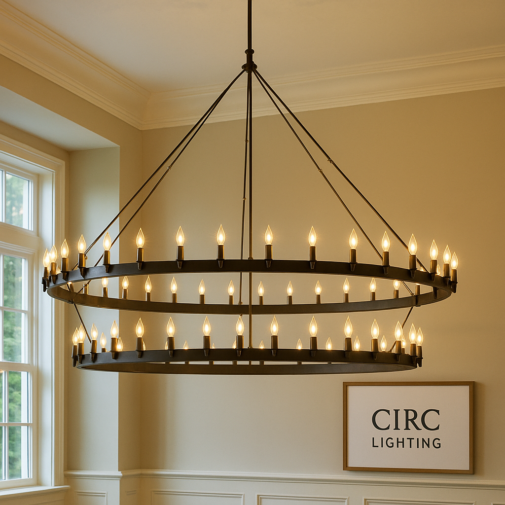 The CIRC Camino Vintage Candelabra Two-Tier Chandelier 71" is a dramatic statement fixture that combines industrial craftsmanship with timeless vintage charm. Featuring two hand-forged, bent angle-iron rings, this chandelier is beautifully tiered and lined with classic candelabra flame bulbs, creating a warm and inviting atmosphere. Its sheet metal-wrapped sockets and textured cast ceiling plate add durability and depth, making it a perfect centerpiece for large dining rooms, great rooms, or double-height spaces.