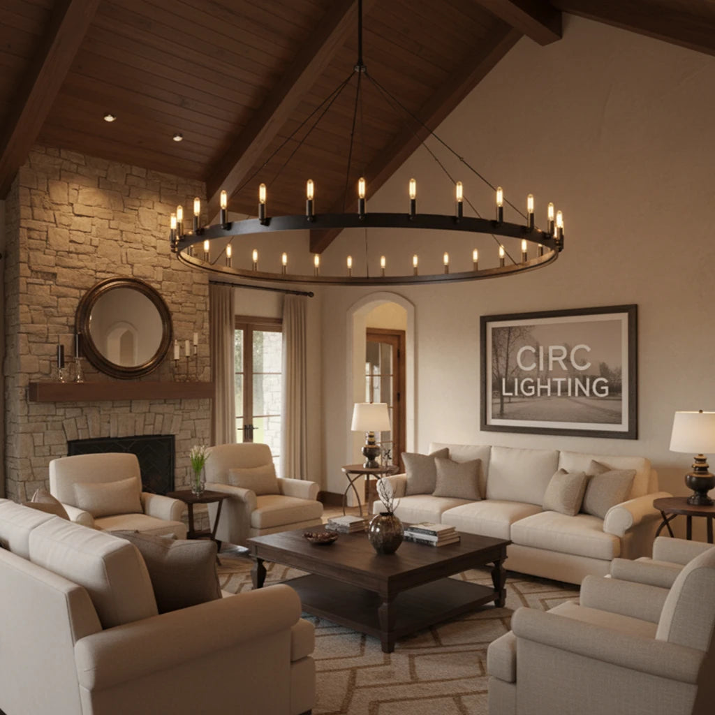 The CIRC Camino Vintage Filament Round Chandelier 73" is a showstopping centerpiece that brings together industrial craftsmanship and vintage elegance. At its heart is a hand-forged, bent-angle brass ring, lined with thirty-six upraised vintage filament bulbs for a dramatic yet inviting glow. The sheet metal-wrapped sockets and textured cast ceiling plate lend rustic charm, while its grand 72¾" diameter ensures it commands attention in large dining rooms, double-height foyers, or open-plan living areas.