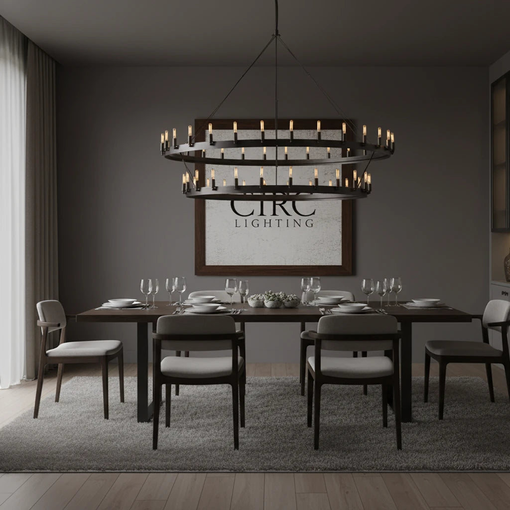 The CIRC Camino Vintage Filament Two-Tier Chandelier 63" is a grand statement piece, blending industrial strength with vintage charm. Featuring two hand-forged, bent angle-iron rings in a bold, tiered formation, this chandelier is adorned with fifty-four upraised vintage filament bulbs that radiate a warm, inviting glow. Its sheet metal-wrapped sockets and textured cast ceiling plate enhance its rugged yet refined character — perfect for large dining rooms, entryways, or great rooms seeking a striking centerpiece.