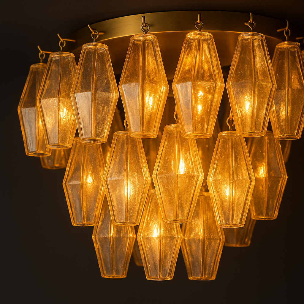 A sculptural and elegant Vintage Luxury Lighting Fixture, the CIRC Chiara Clear Glass Flushmount 17" features multiple clear blown-glass shades arranged on a sleek steel frame. This three-light fixture delivers bright, multi-directional illumination, creating a sophisticated and artistic statement for dry interior spaces with standard ceiling heights.