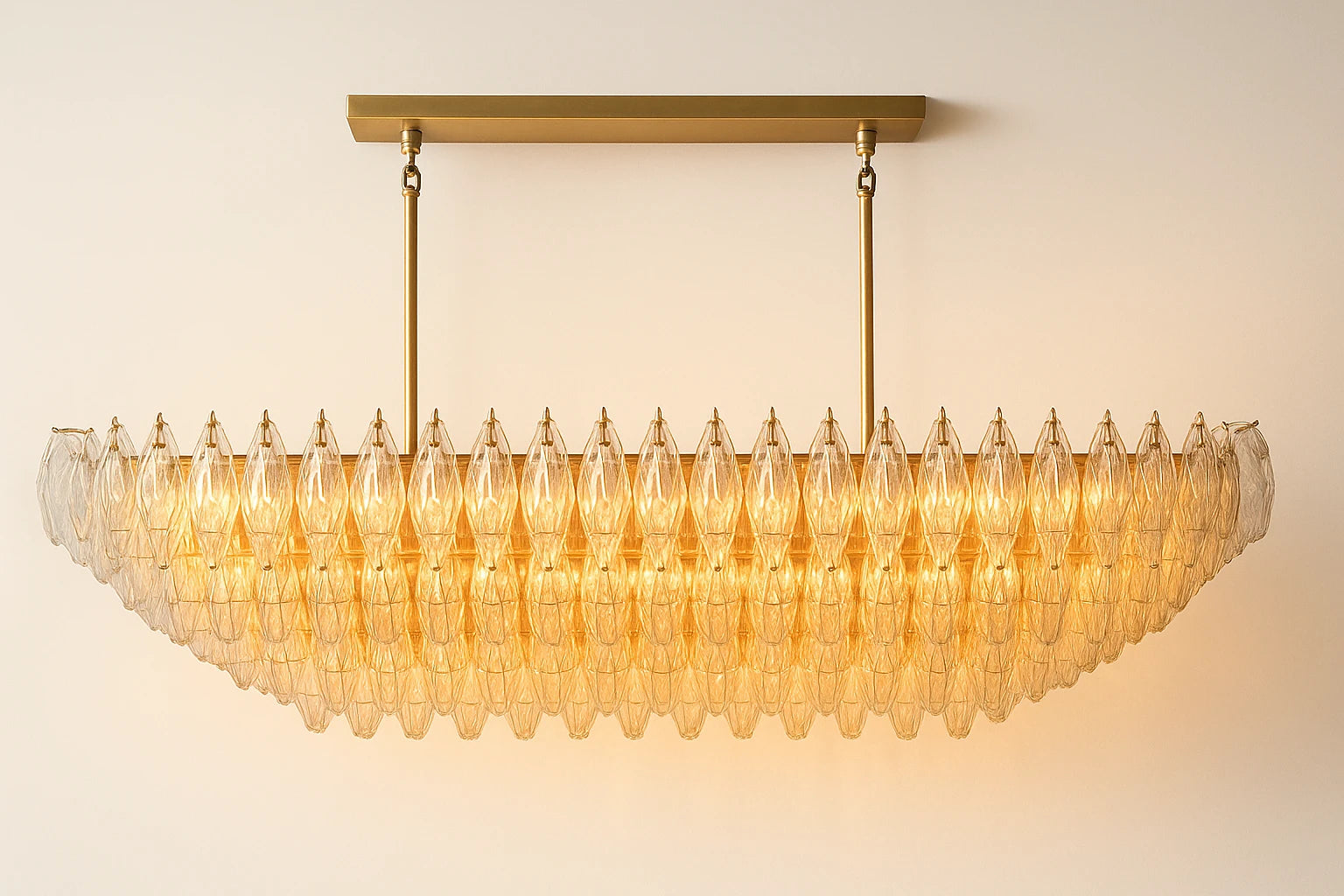 This elegant chandelier is a perfect blend of modern design and artisanal quality, making it a stunning focal point for a dining table or kitchen island.