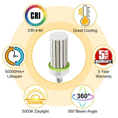 The CIRC 100W LED Retrofit Corn Bulb provides high-efficiency, daylight-quality illumination for commercial, industrial, and retrofit applications. Designed to replace traditional HID or CFL bulbs, it delivers bright 5000K lighting with uniform 360° coverage, ideal for warehouses, workshops, factories, and outdoor areas.