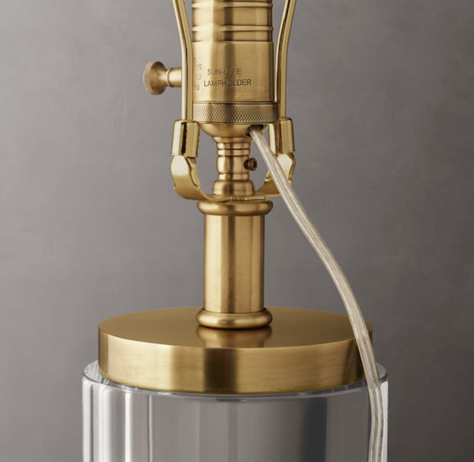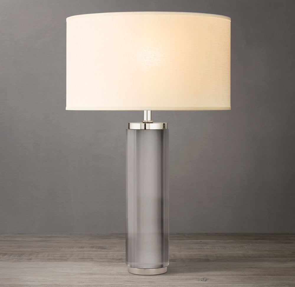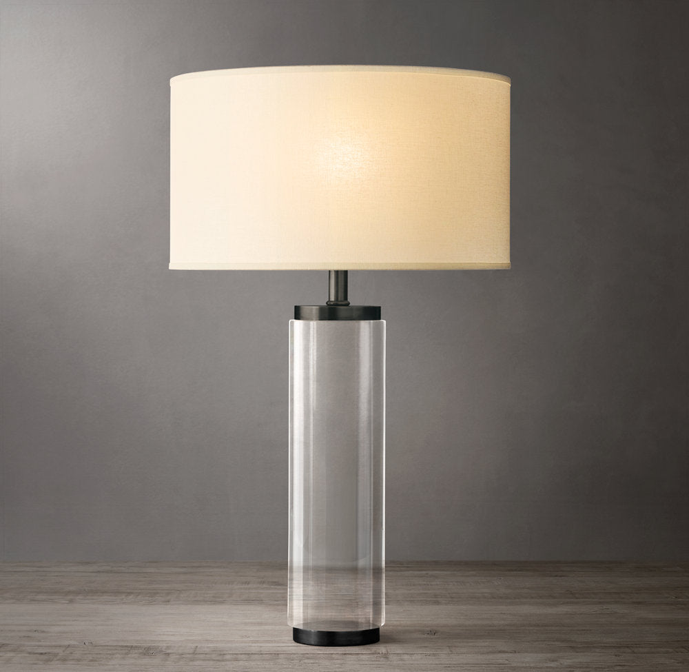 The Cylindrical Column Crystal Table Lamp features a sleek optical-grade clear crystal glass column accented with steel hardware. Designed for versatile styling, it can be paired with our French Drum Linen Shade, size E, or customized with your choice of shade, providing both elegance and functionality for any interior.