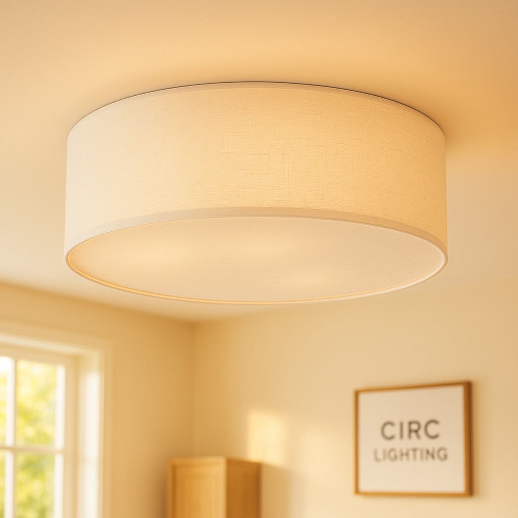A larger, tailored, and elegantly understated Vintage Luxury Lighting Fixture, the CIRC Échelon Flushmount 18" provides warm, diffused ambient light. The wide, shallow shade is wrapped in 100% natural linen and finished with rolled self-fabric edges for a refined, seamless appearance. This low-profile fixture is a sophisticated and textural choice for dry interior spaces with standard ceiling heights.