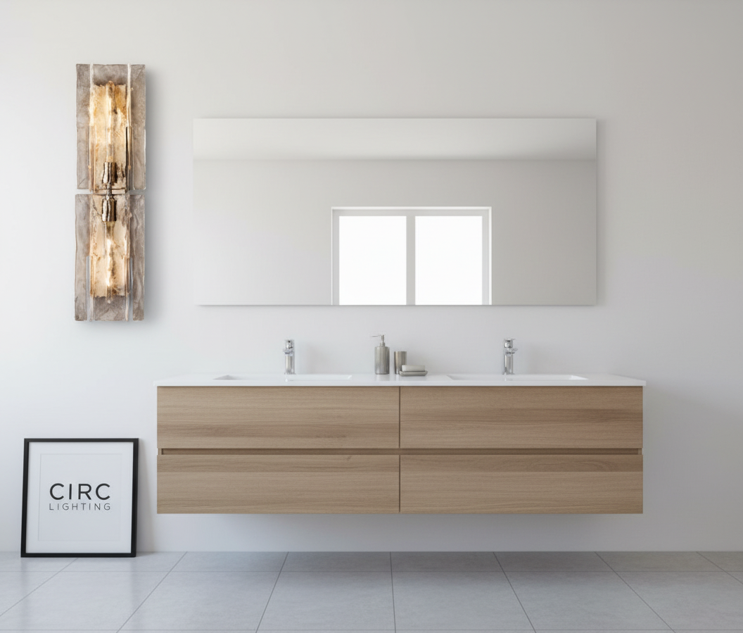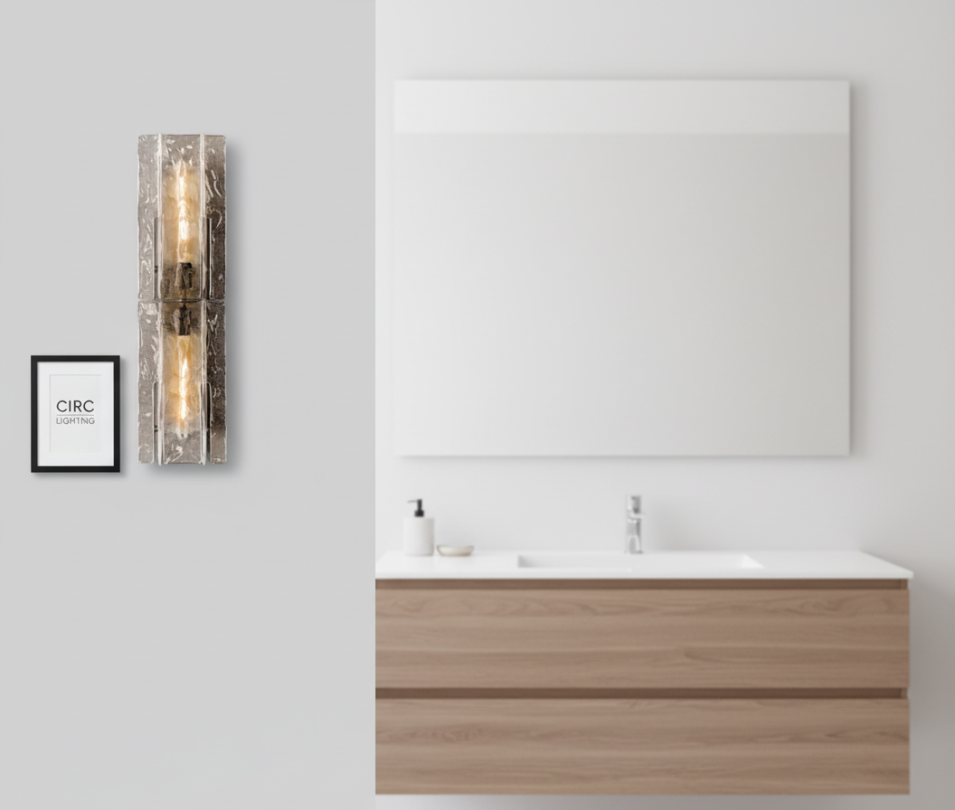 The CIRC Lattice Clear Glass Sconce 30" combines sculptural design with artisanal craftsmanship, featuring handcast glass and a solid steel frame. The glass is formed in a custom mold to create its distinctive rippled texture, diffusing light beautifully while maintaining clarity. Designed for versatility, it can be mounted vertically or horizontally, bringing contemporary elegance to bathrooms, hallways, and sheltered outdoor spaces.
