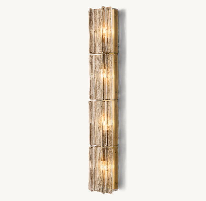 A dramatic, oversized statement sconce featuring smoke-tinted, handcrafted cast-glass panels with a distinctive rippled texture and a tall architectural silhouette.