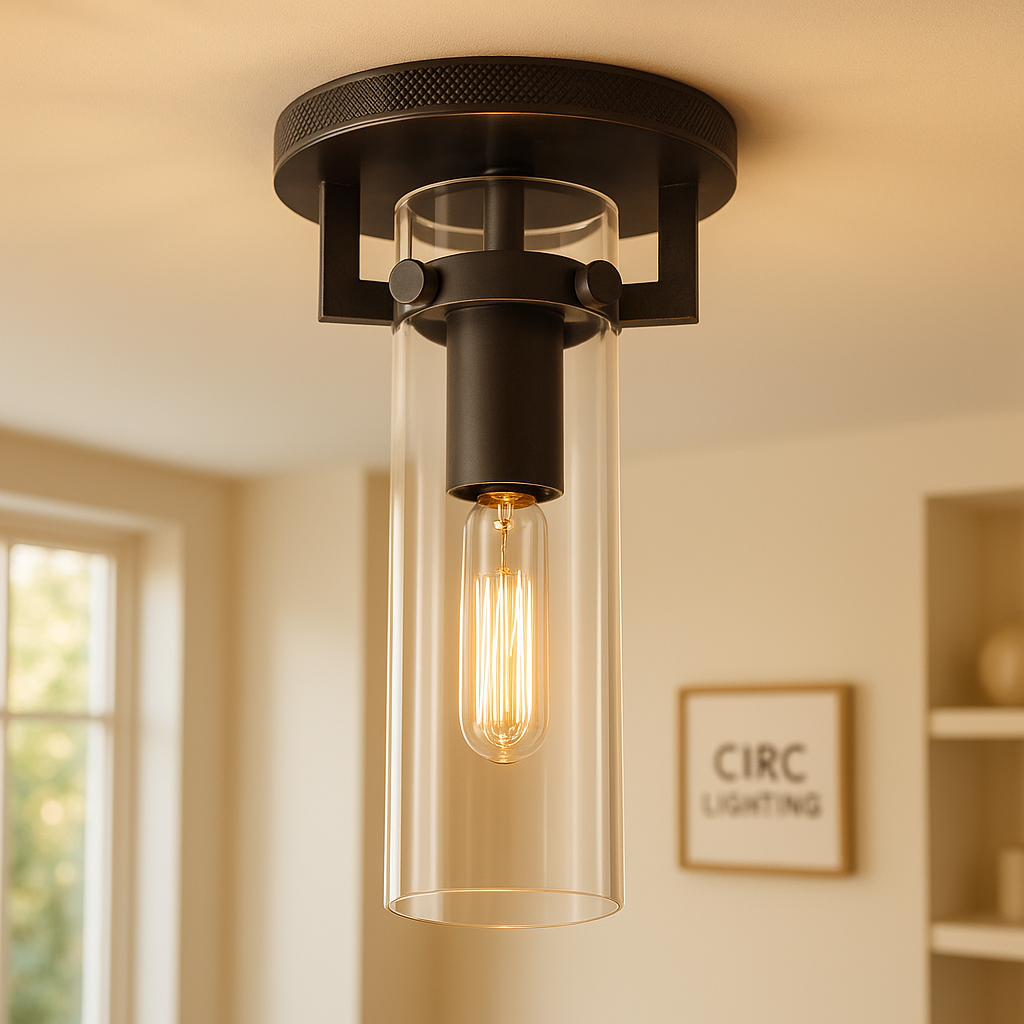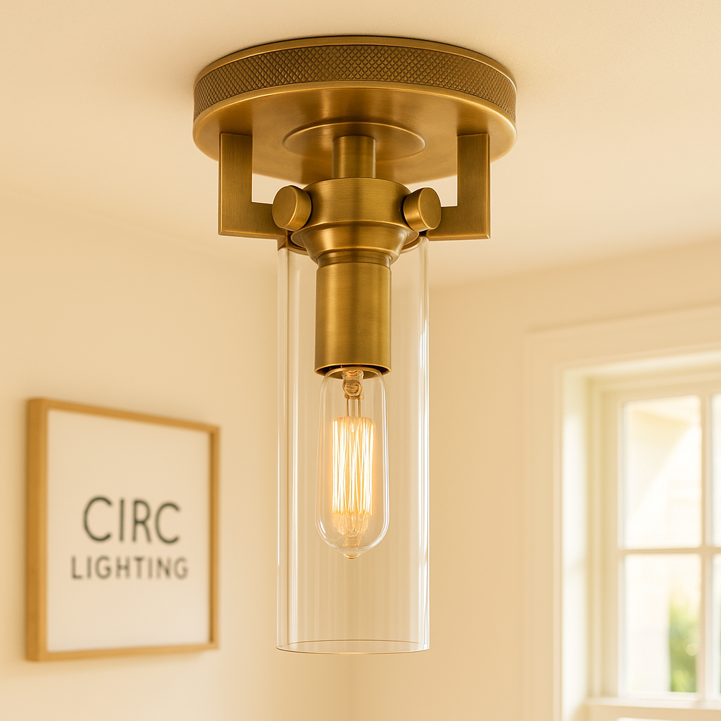 A minimalist yet functional Vintage Luxury Lighting Fixture, the CIRC Machinist Glass Cloche Flushmount showcases a sleek metal frame paired with a handcrafted glass cloche shade. The fixture’s frame material varies by finish: