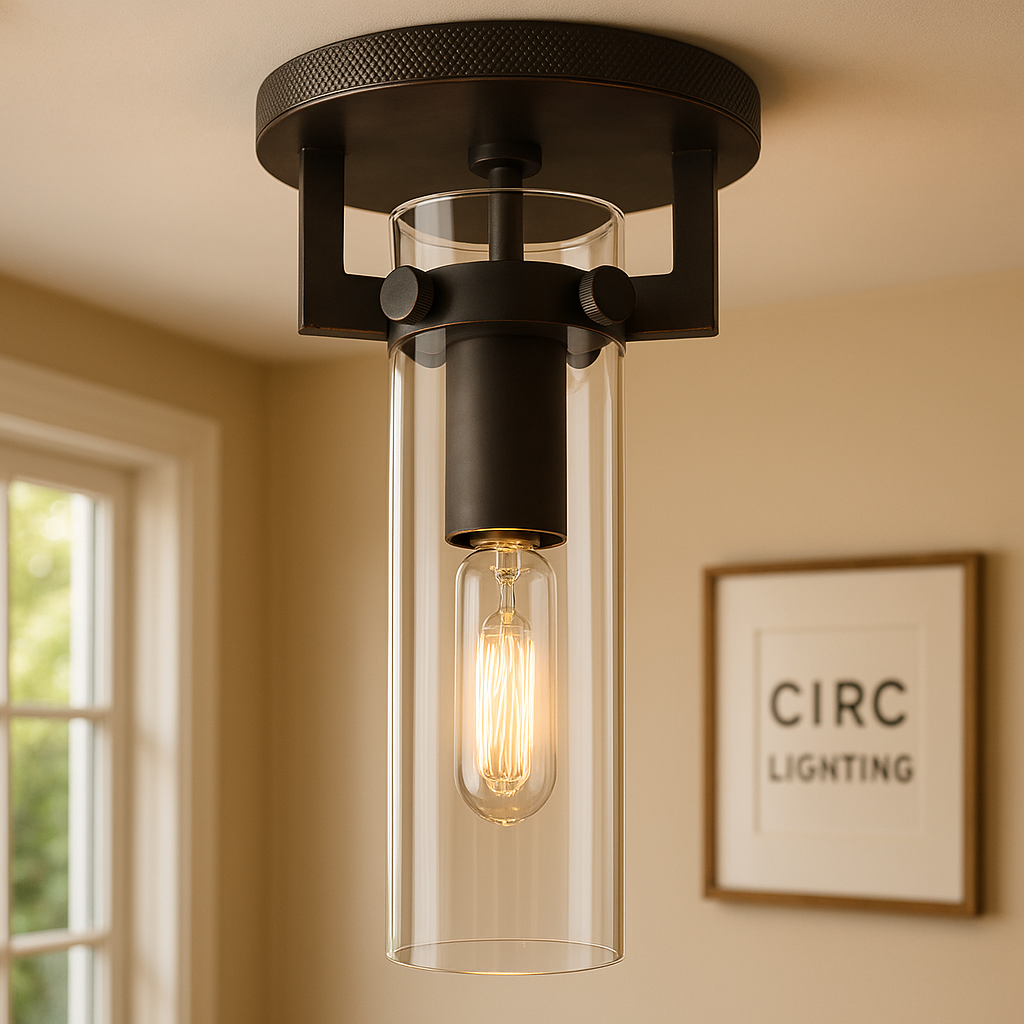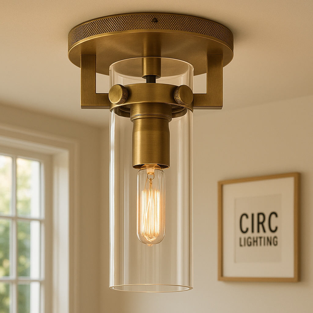 The CIRC Machinist Glass Cylinder Flushmount is a sleek and modern lighting fixture, part of a collection that marries industrial inspiration with high-quality craftsmanship. Enclosed in a narrow, cylindrical hand-blown glass shade, this flushmount is ideal for providing focused, ambient light in a variety of indoor spaces, particularly in damp locations like bathrooms due to its certification. The fixture is available in several high-quality metal finishes, ensuring a tailored look for your space.