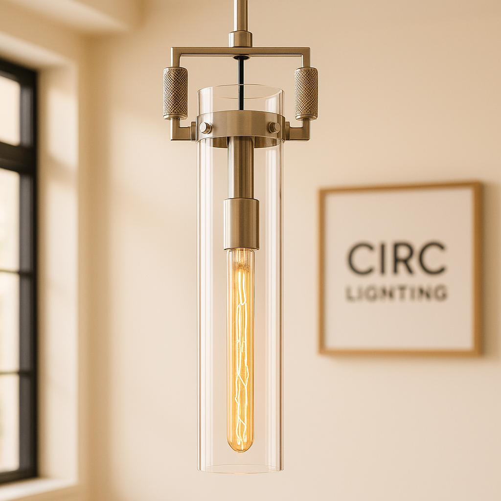 A sleek, elongated Vintage Luxury Lighting Fixture, the CIRC Machinist Glass Cylinder Pendant showcases an industrial-inspired silhouette with artisanal glass craftsmanship. The frame material varies by finish: Lacquered Burnished Brass is solid brass, while Bronze and Polished Nickel are solid steel. Each pendant features a tall mouth-blown glass cylinder shade, which may include subtle air bubbles or slight asymmetry, underscoring the handmade artistry. With Damp UL certification, vaulted ceiling compatibility, and adjustable rods, this collection is equally suited for grouping or as individual statement pieces in kitchens, bathrooms, and contemporary interiors.