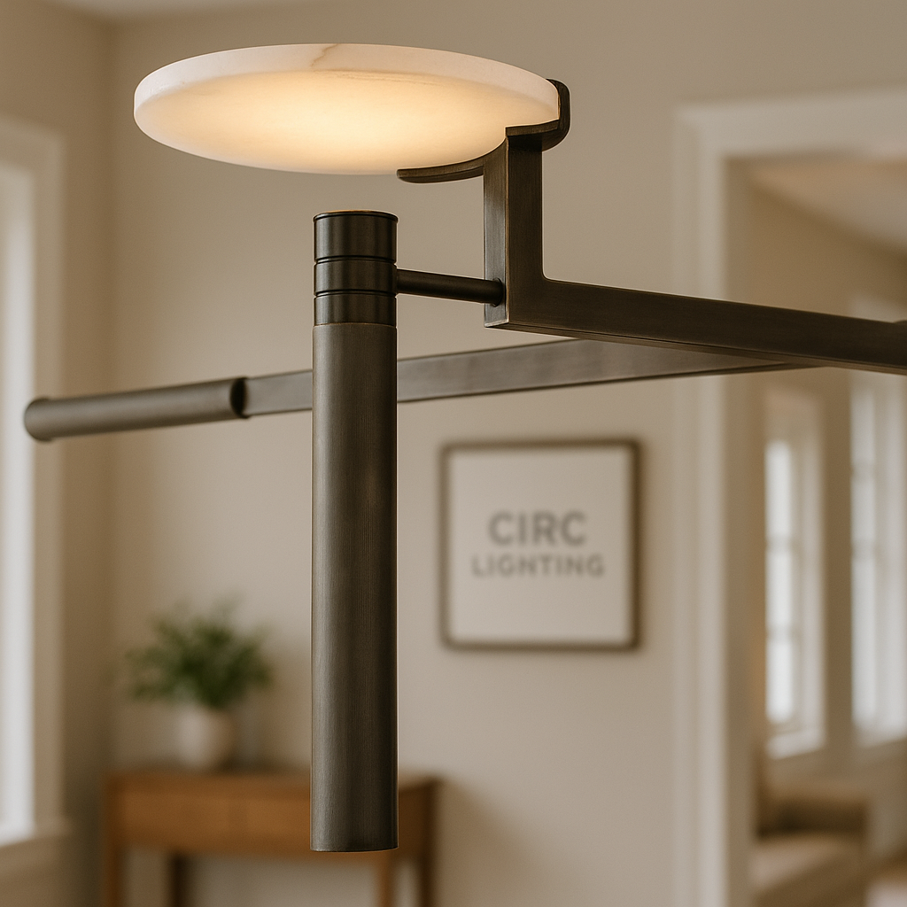 A sleek Vintage Luxury Lighting Fixture, the CIRC Melange Round Chandelier 45" is a sophisticated blend of minimalist design and exquisite materials. It features a handcrafted brass frame supporting three substantial, disc-shaped shades made from natural alabaster. Each piece of alabaster is unique, with its own distinct veining and color variations, ensuring no two chandeliers are exactly alike. The integrated LED modules cast a soft, warm light that beautifully illuminates the natural stone, creating a stunning and artistic focal point in any room.