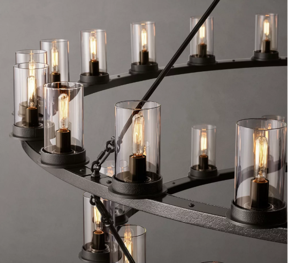 A rustic yet refined Vintage Luxury Lighting Fixture, the CIRC Ondra Round Two-Tier Clear Glass Chandelier 72" is a commanding centerpiece crafted through hand-forged artistry. Its expansive two-tiered frame of bent angle-iron and slender rods showcases a distinctive fire-burnt texture, giving it a rugged yet elegant character. Clear glass shades cradle energy-efficient LED bulbs, producing a warm, inviting glow that enhances its bold, industrial-inspired aesthetic.