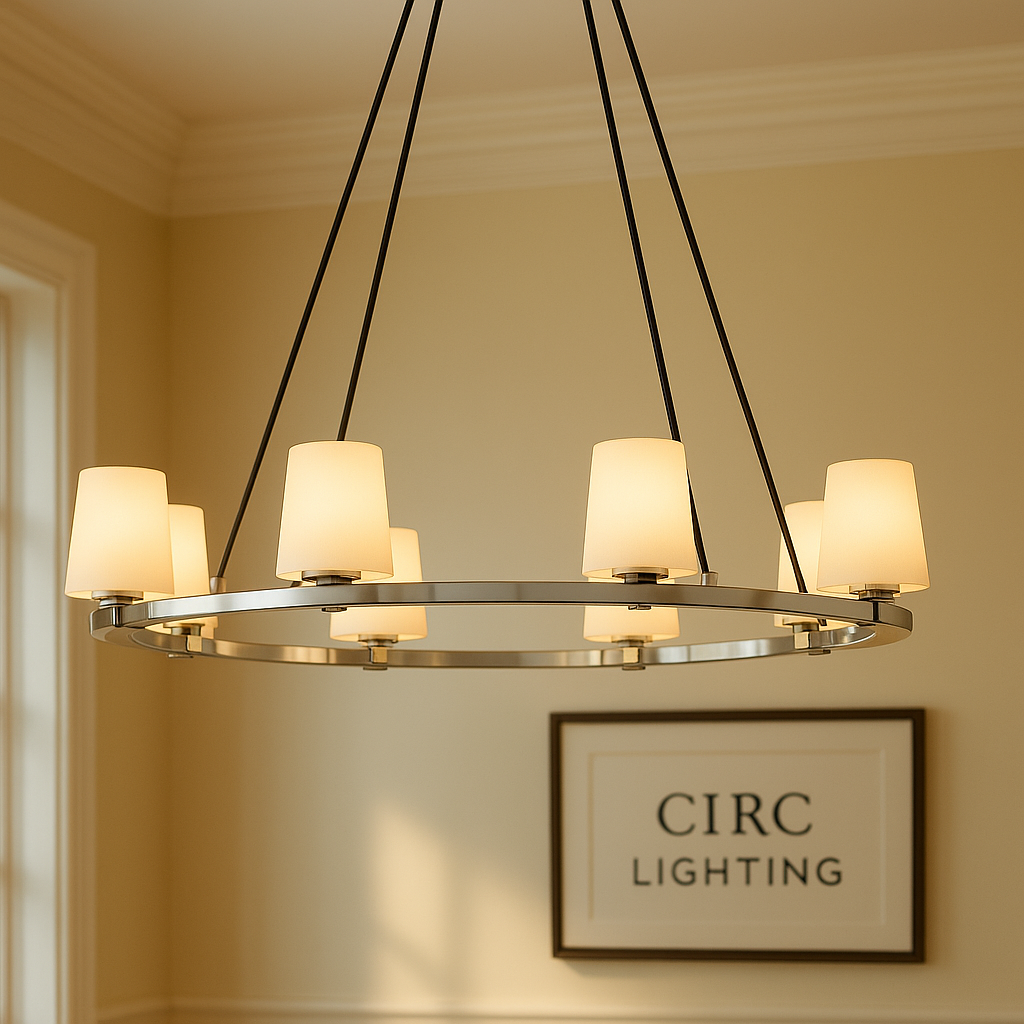 The CIRC Pauillac Fabric Shade Round Chandelier 36" combines contemporary design with the soft elegance of fabric shades. Crafted from solid brass and available in Polished Nickel, Lacquered Burnished Brass, or Live Bronze (which patinas over time), this chandelier is both versatile and timeless. Its white cotton-linen tapered shades gently diffuse light from eight candelabra bulbs, creating a warm and intimate ambiance. The adjustable rod system allows for a customizable hanging length, making it ideal for dining rooms, living spaces, and entryways.