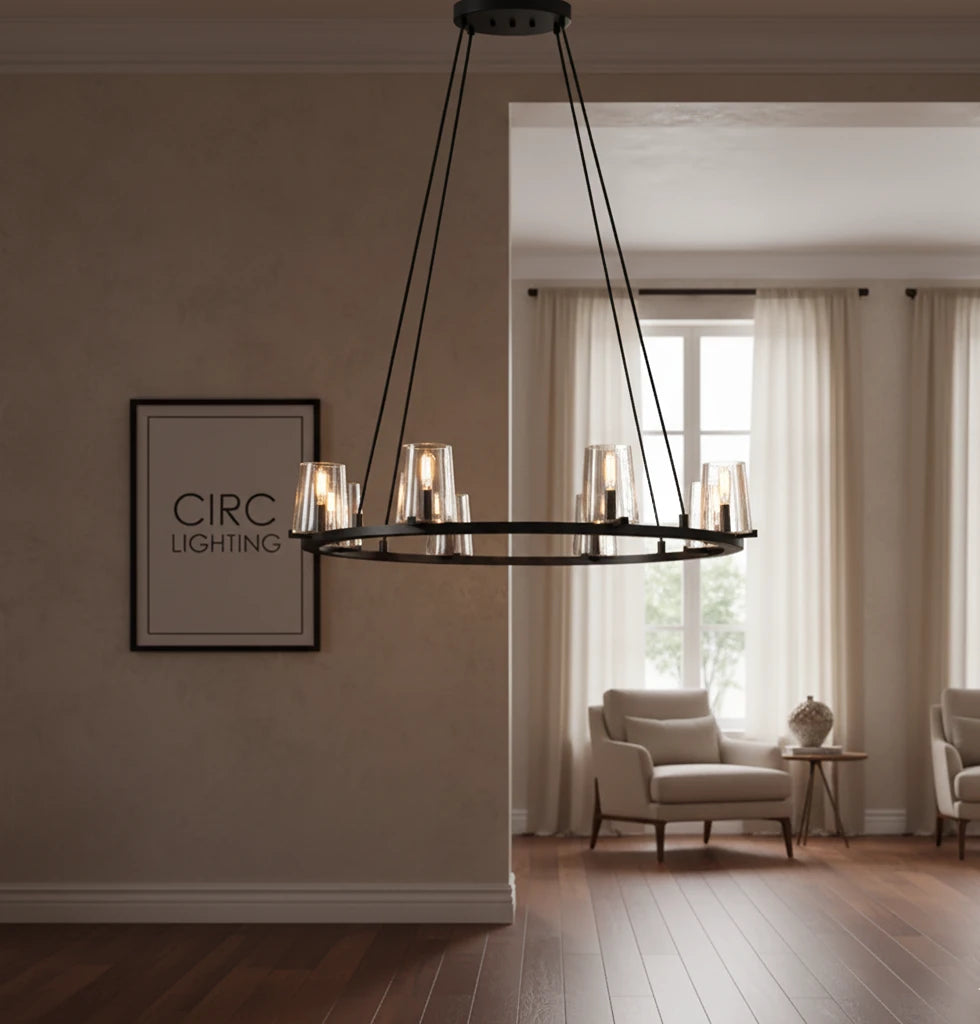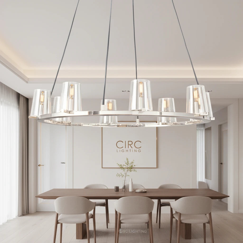 The CIRC Pauillac Round Chandelier 36" is a statement in refined simplicity, offering a clean, contemporary design with timeless appeal. Crafted from solid brass and finished in Polished Nickel, Lacquered Burnished Brass, or a live Bronze that develops a natural patina over time, this chandelier exudes elegance. The hand-blown clear glass tapered shades soften the glow from its eight candelabra bulbs, creating a warm, welcoming ambiance ideal for dining rooms, living rooms, or entryways. Its adjustable rod system allows for a fully customizable hanging length.
