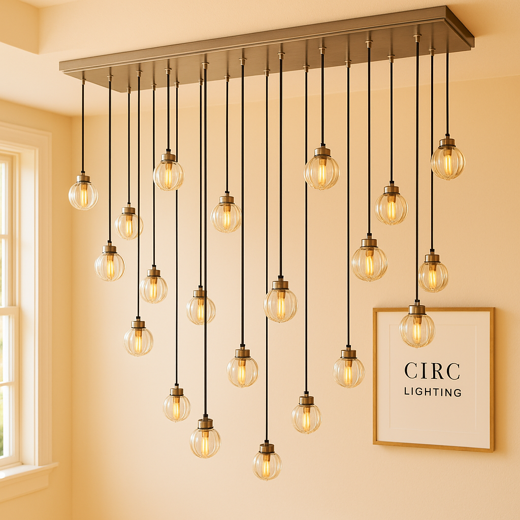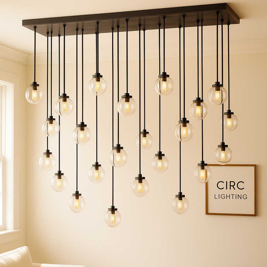 A truly spectacular and immense Vintage Luxury Lighting Fixture, the CIRC Pearl Rectangular Chandelier 72" is the grandest linear design in the Pearl Collection, crafted for monumental interiors such as expansive dining rooms, great rooms, or oversized kitchen islands. Its colossal brass canopy supports thirty-three bulbs and hundreds of substantial K9 crystal spheres, or “pearls,” each hand-carved to perfection. Weighing over 350 lbs., this chandelier delivers an unrivaled statement of scale and brilliance, while its Damp UL certification ensures safe use even in moisture-prone luxury spaces.