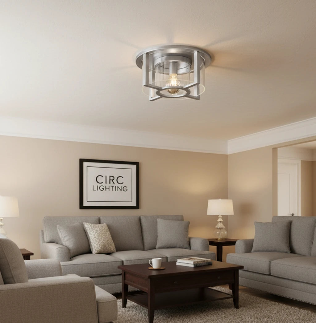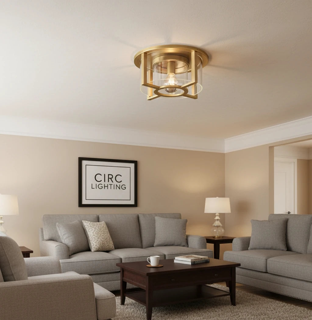 The CIRC Pétrus Round Flushmount showcases a refined silhouette that pairs solid brass with a double-layered glass shade, offering a sophisticated balance of structure and softness. Its inner cylindrical shade available in both clear and frosted glass allows customizable light diffusion, while the hand-finished brass frame adds timeless appeal. Perfect for bathrooms, hallways, or covered outdoor areas, this versatile fixture enhances any space with subtle radiance and craftsmanship.