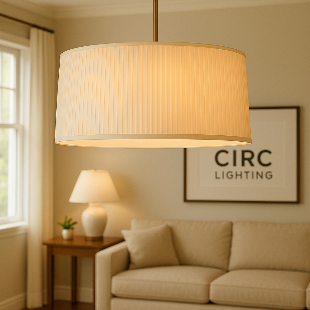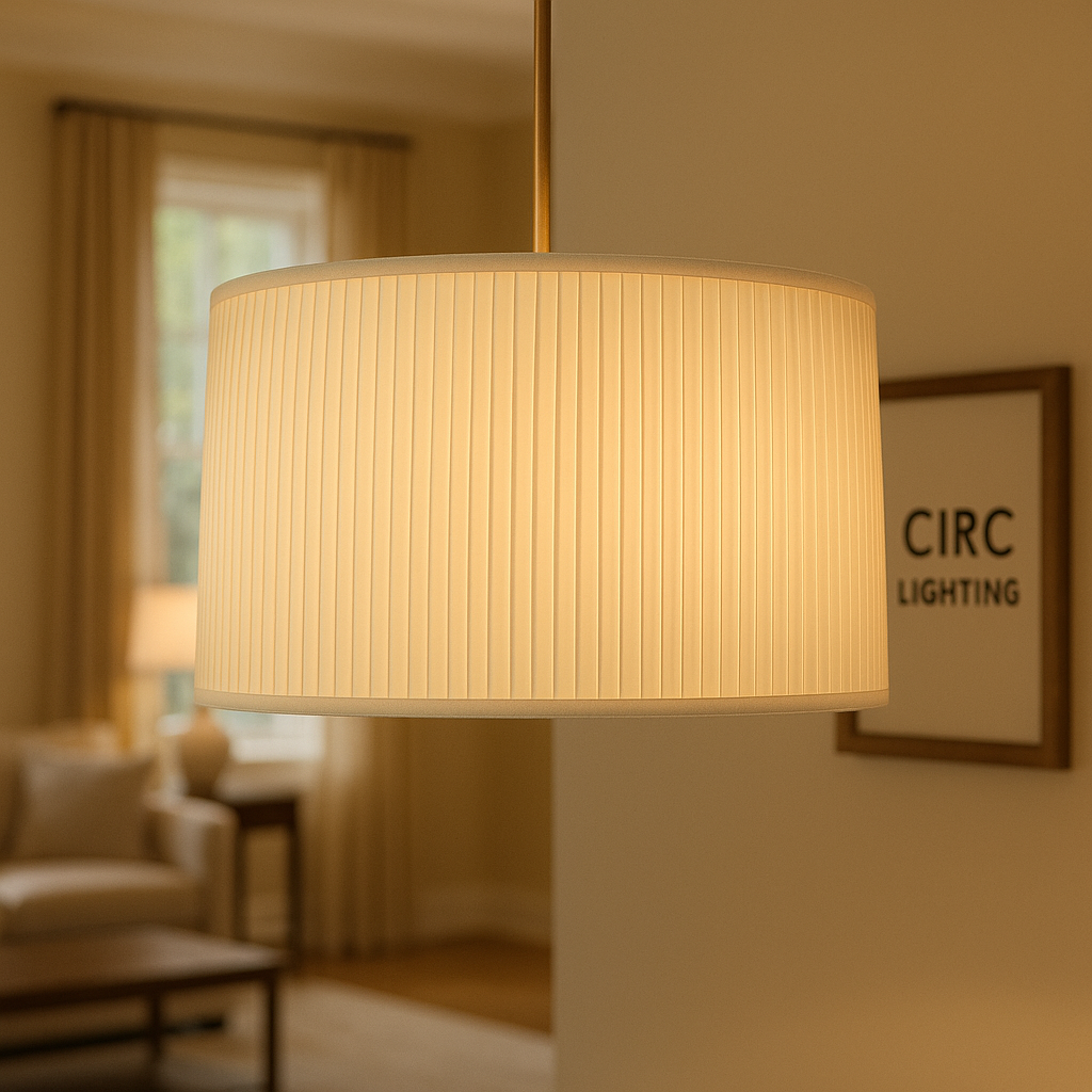 The CIRC Reed Pleated Drum Pendant captures timeless elegance through its refined drum shade silhouette and graceful proportions. Crafted with a durable steel frame and a meticulously pleated white silk shade, this pendant radiates soft, diffused illumination ideal for dining rooms, living spaces, or grand entryways. The adjustable rod design offers flexibility for vaulted ceilings, while its minimalist geometry brings a touch of classic luxury to modern interiors.