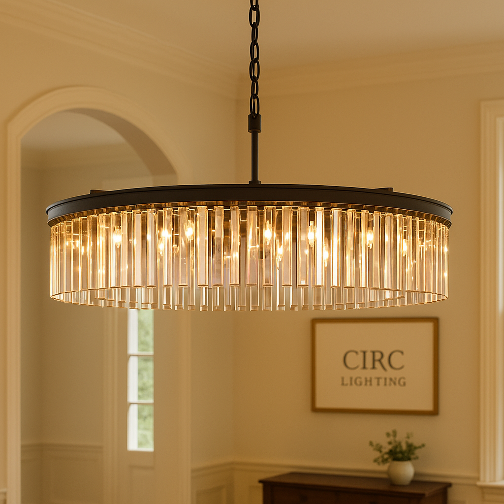 A brilliant and dramatic Vintage Luxury Lighting Fixture, the CIRC Rhys Round Chandelier 43" combines industrial form with jewel-like sophistication. Its iron ring frame is draped with a cascade of solid K9 glass prisms, prized for their exceptional clarity (the same quality glass used in optical lenses). These prisms refract light into a dazzling display, creating a breathtaking focal point on a grander scale — ideal for a modern or contemporary space.