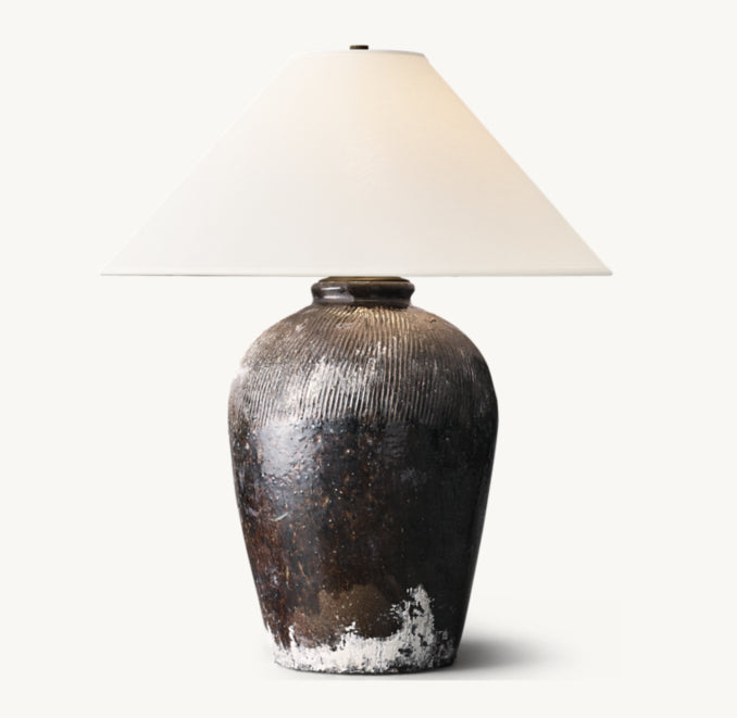 The Rice Wine Vessel Table Lamp is crafted from authentic Chinese terra-cotta wine vessels once used to store traditional rice wine. Each lamp carries its own history, patina, and artisanal character — making every piece truly one-of-a-kind. Its earthy texture and sculptural presence bring warmth and cultural depth to any interior.