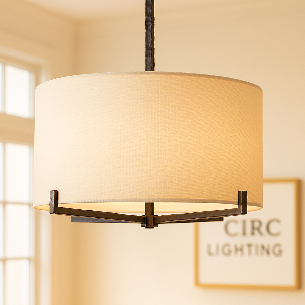 A classic and versatile Vintage Luxury Lighting Fixture, the CIRC Ryder Pendant blends the strength of hand-forged iron with the soft refinement of a linen shade. The frame is hand forged from iron, giving the fixture a substantial, artisanal character, while the white linen drum shade with integrated diffuser delivers a balanced, ambient glow. Suspended by a height-adjustable chain and fully compatible with vaulted ceilings, this pendant makes an elegant statement over dining areas, bedrooms, or other dry interior spaces.