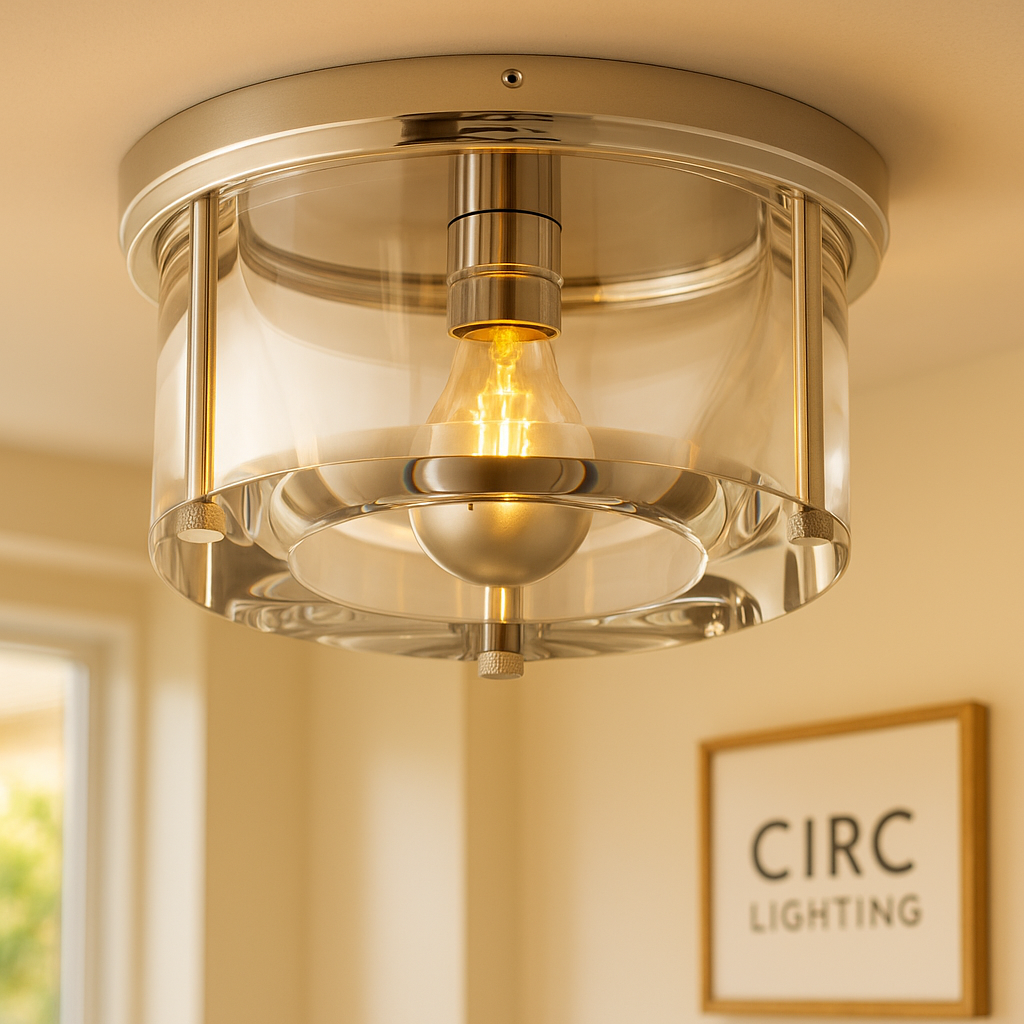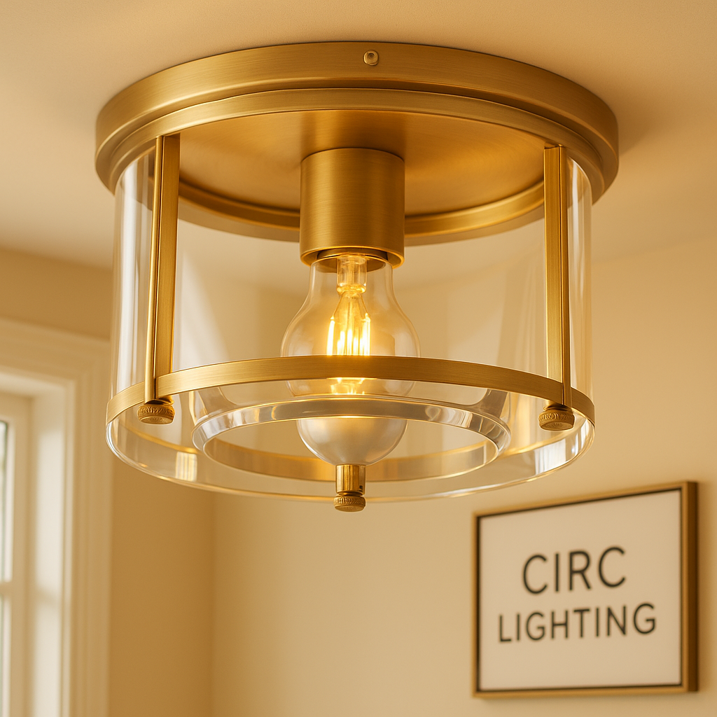 A robust and elegant Vintage Luxury Lighting Fixture, the CIRC Savile Round Flushmount combines the strength of sand-cast brass with the brilliance of crystal glass. The frame is handcrafted of sand-cast brass, and the diffuser is made of high-clarity K9 glass (an optical crystal), providing a sparkling yet low-profile illumination. With a Damp UL certification, this versatile flushmount is suitable for upscale bathrooms, moist indoor areas, and sheltered outdoor spaces.