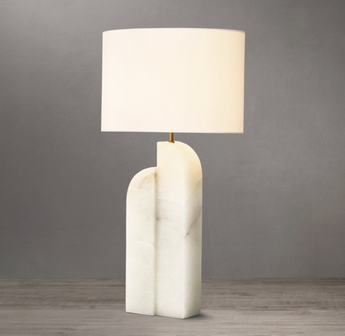 The Savoye Table Lamp – Left blends sculptural elegance with luxe natural stone. Handcrafted from solid alabaster or marble, each piece showcases completely unique veining and coloration. Paired with a crisp white linen oval shade, this lamp brings refined architectural beauty to consoles, living rooms, and bedrooms.