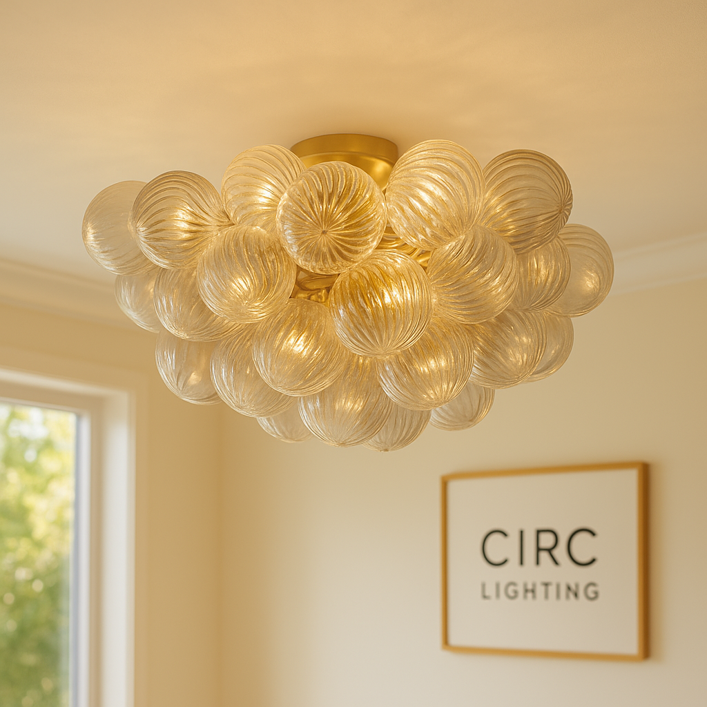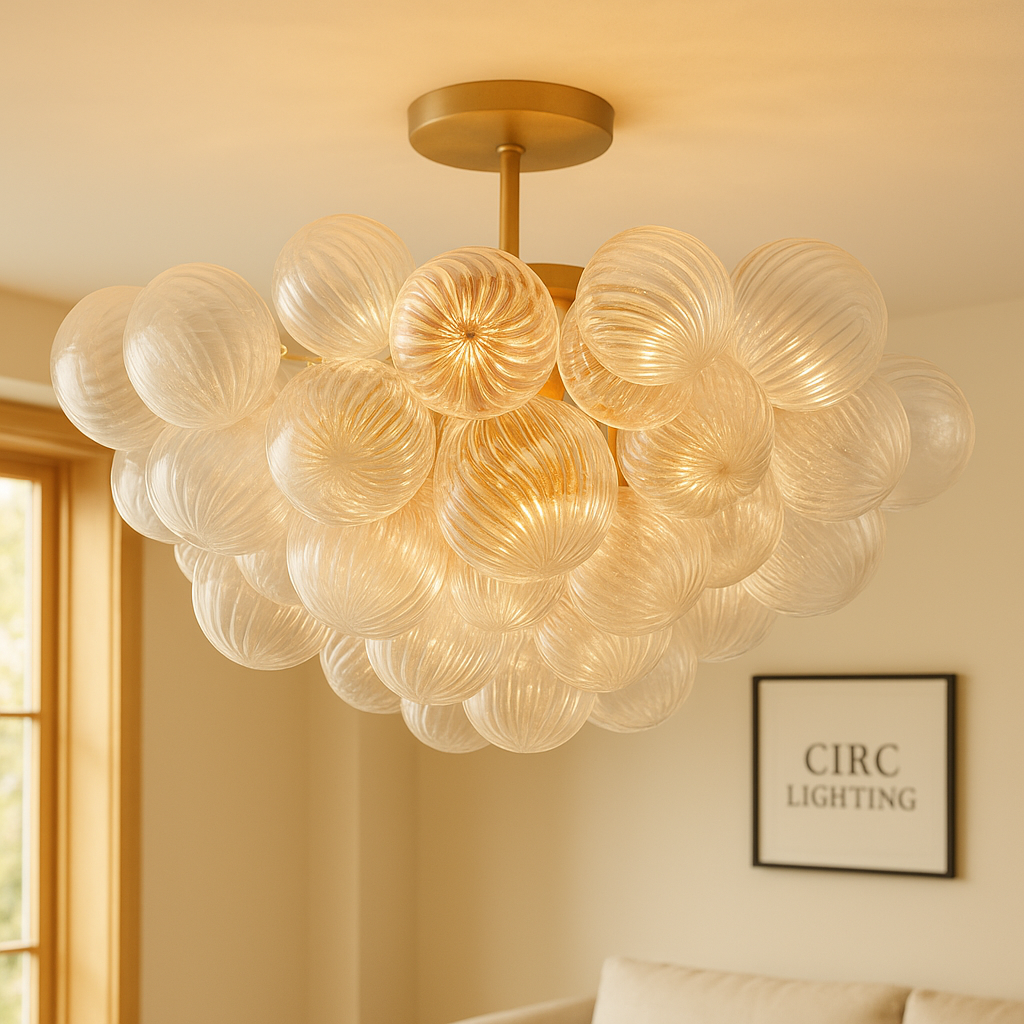 Features 33 mouth-blown rippled glass orbs that create soft, multi-directional diffusion.