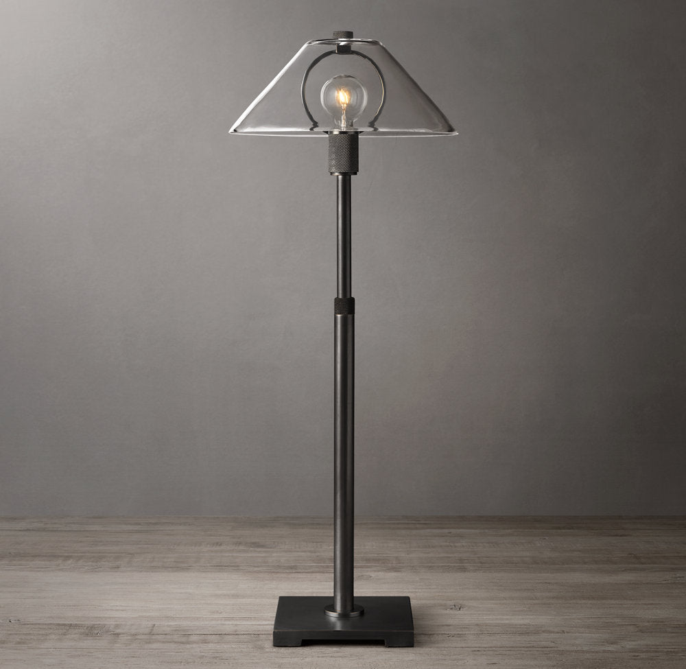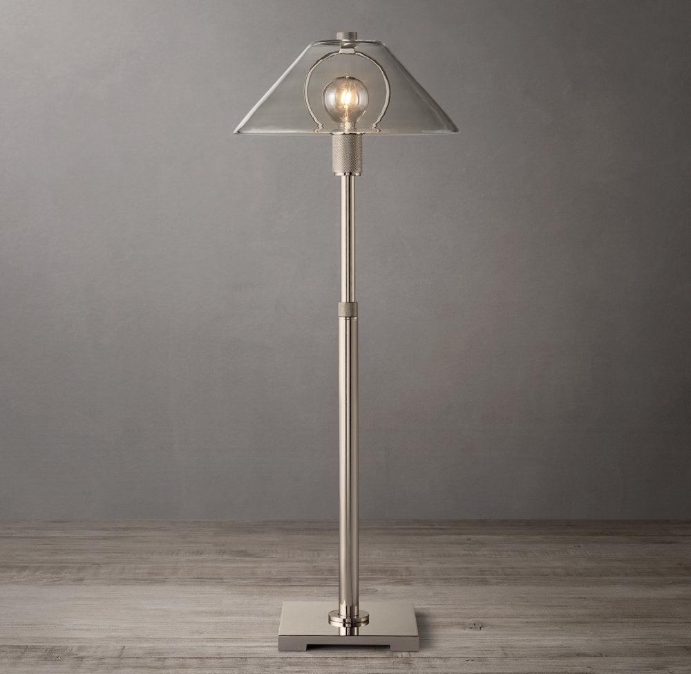 The Utilitaire Glass Shade Table Lamp combines steel craftsmanship with a sleek, clear glass slope shade, offering adjustable height for versatile ambient lighting. Its minimalist design is ideal for modern interiors, while the glass shade provides a subtle, elegant glow.