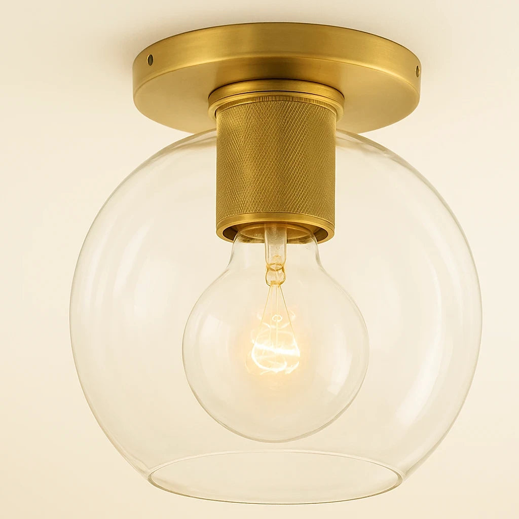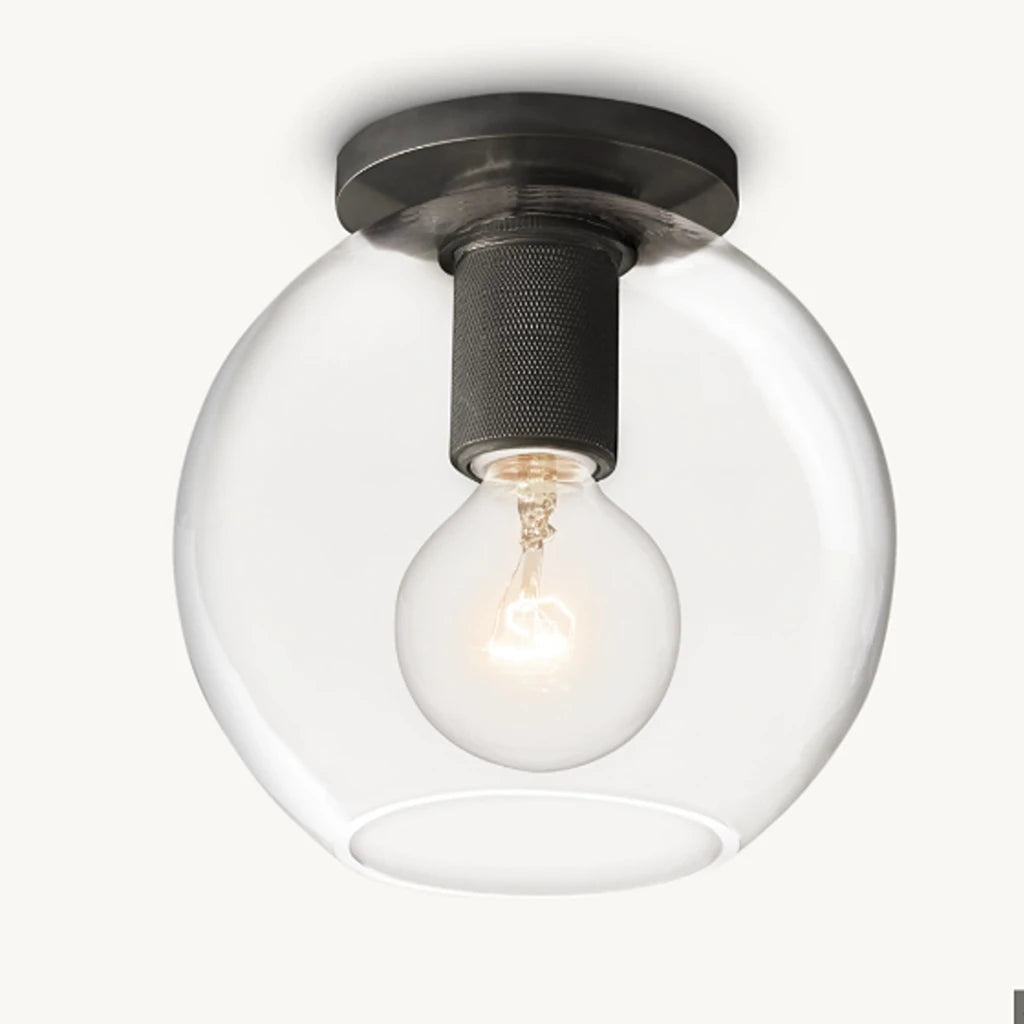 The CIRC Utilitaire Globe Shade Flushmount pairs handcrafted aluminum and zinc with a handblown glass globe, blending industrial refinement with artisan craftsmanship. Each shade’s subtle variations from tiny air bubbles to natural asymmetry are hallmarks of its handmade character, ensuring every fixture is one of a kind. Ideal for damp spaces, its simple silhouette and soft glow make it perfect for bathrooms, hallways, or smaller living areas.