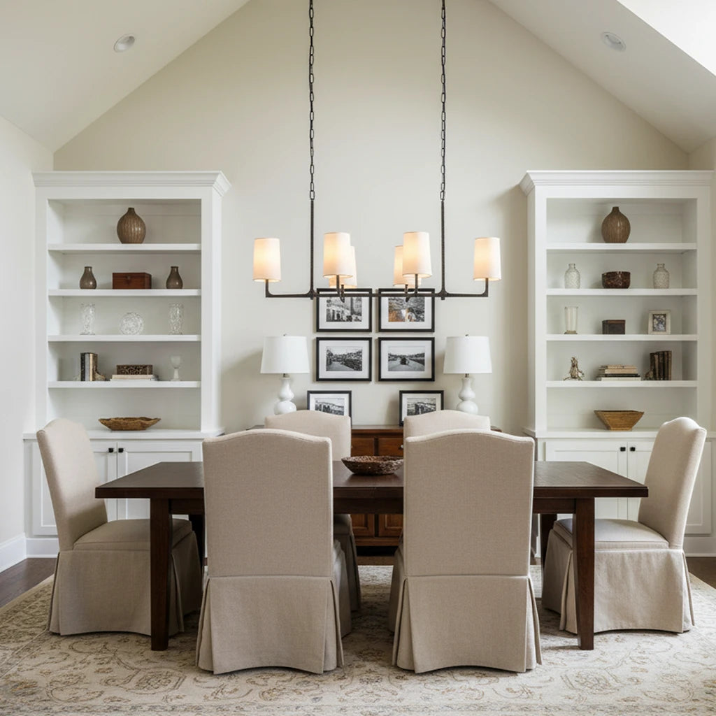 The CIRC Wright Linear Chandelier 54" blends handcrafted texture with the soft elegance of fabric shades, making it an ideal centerpiece for a long dining table or kitchen island. Its frame is meticulously handcrafted from iron, aluminum, or brass (depending on finish) and hand-hammered for a unique artisanal character. With eight cylindrical white linen shades, this chandelier delivers a warm, diffused glow while maintaining a sleek, linear profile.