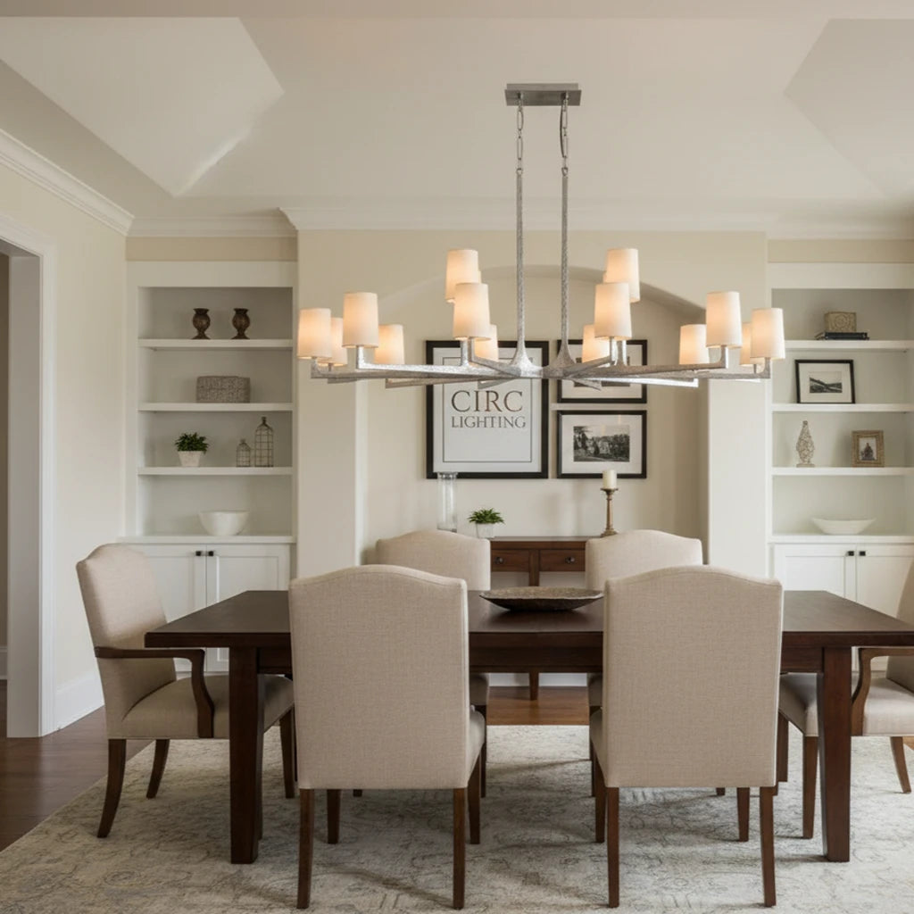 The CIRC Wright Round Chandelier 60" blends handcrafted texture with the soft elegance of fabric shades on a grander scale. Its frame is meticulously handcrafted from iron, aluminum, or brass (depending on finish) and hand-hammered for a unique artisanal character. With sixteen cylindrical white linen shades, this chandelier delivers a warm, diffused glow, creating a dramatic centerpiece for large spaces.